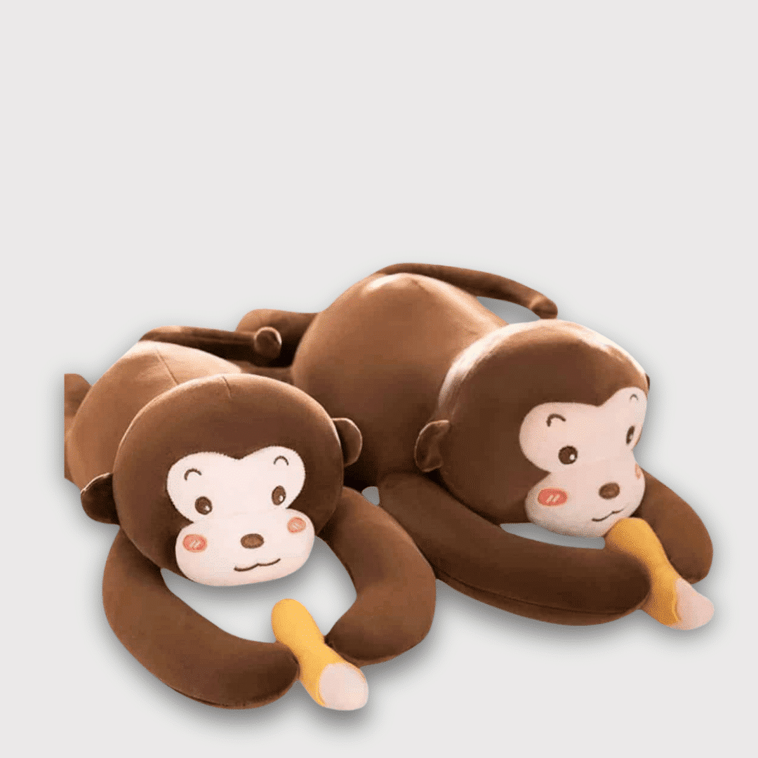 Ce doudou singe à bras long avec sa banane jaune épluchée offre à votre enfant une compagnie douce et réconfortante. Un ami idéal pour les moments de câlins et d’aventure.